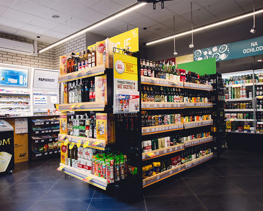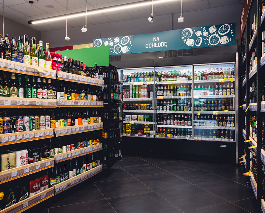 Szeroka oferta alkoholi, napojów, przekąsek, w tym setki schłodzonych produktów.